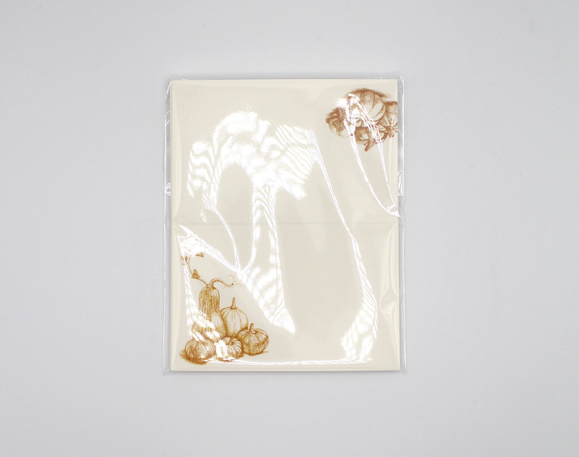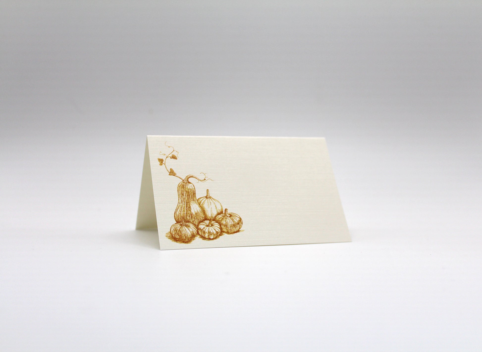 Hand-drawn pumpkins and gourds in warm golden tones make these folded place cards a beautiful addition to autumn and Thanksgiving tablescapes.