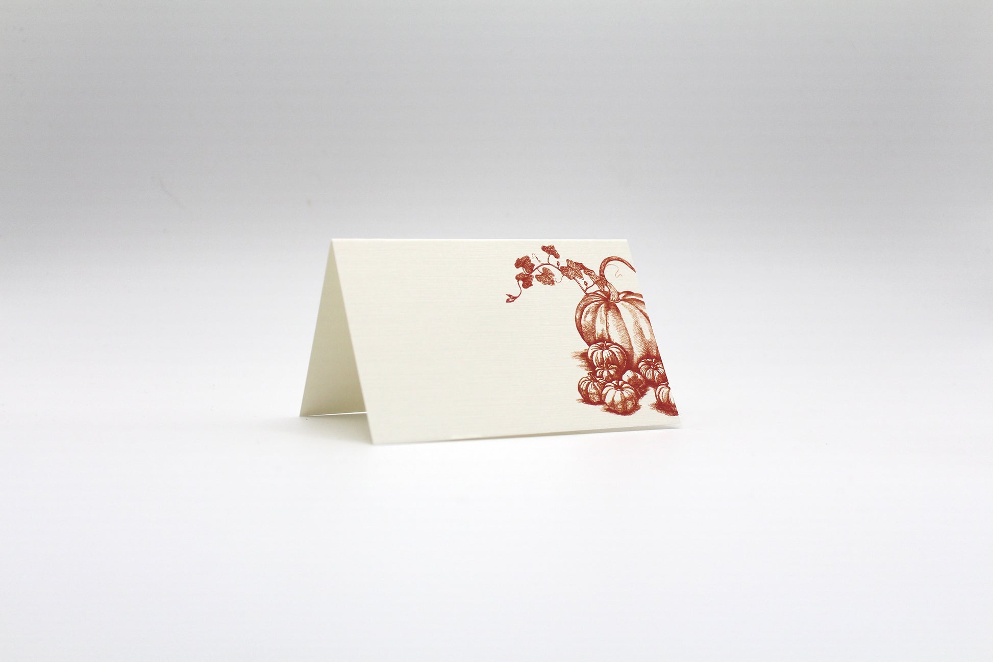 Featuring hand-illustrated pumpkins with trailing vines in rich autumn tones, these folded place cards are perfect for festive fall gatherings.