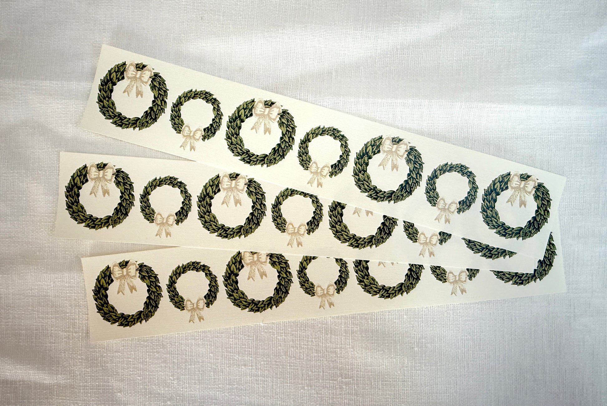 Hand-drawn evergreen wreaths tied with cream bows – an instant touch of holiday cheer for festive dining.